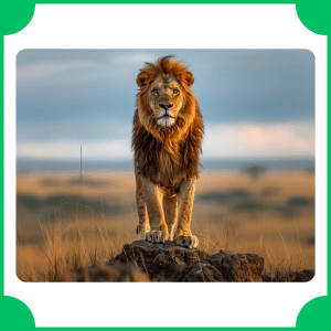The lion is a large wild cat known for its strong body and thick mane in males. Its name comes from Latin leo. It lives in forest edges and grasslands and is famous for strength, leadership, and social group living.