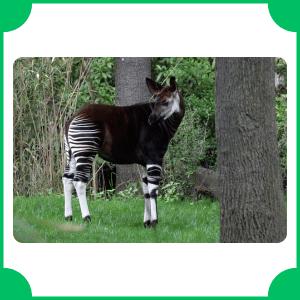 The okapi is a rare animal related to the giraffe, with striped legs. Its name comes from an African language. It lives in dense forests and is known for its unique appearance and quiet nature.