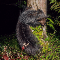 The Aye-Aye is a small nocturnal mammal found in Madagascar. It has a thin body, large ears, and very long fingers. Its middle finger is used to find insects inside trees, which makes it look unusual and quite different.