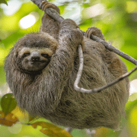 The Sloth is a slow-moving mammal that lives in the forests of Central and South America. It spends most of its time hanging upside down on trees. Its calm nature and very slow movement make it look relaxed and gentle.
