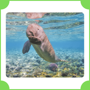 Dugong is a large marine mammal closely related to manatees. It lives in warm coastal waters and feeds on seagrass. It moves slowly while swimming and spends most of its time grazing underwater plants.