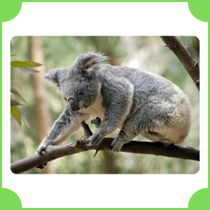 Koala is a tree-dwelling mammal found in Australia. It has thick grey fur and a round face. It moves slowly and spends most of its time sleeping or eating eucalyptus leaves, which provide very low energy.