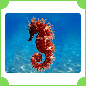 Seahorse is a small fish with a horse-like head and curled tail. It lives in shallow ocean waters and moves slowly by fluttering its fins. It often stays still to blend with plants and avoid predators.