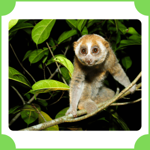 Slow Loris is a small primate found in Asian forests. It has large eyes and a soft body. It moves very slowly and carefully at night, using strong hands to grip branches while searching for food.